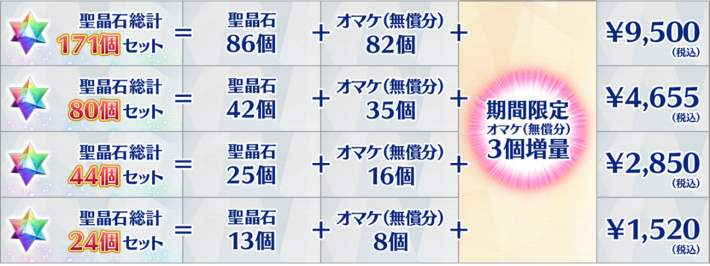 キャンペーン期間中、ゲーム内での「聖晶石」ご購入より5%割引に加えて、すべての商品のオマケ聖晶石が3個増量いたします。