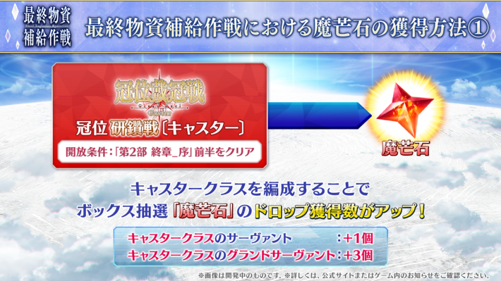 「冠位研鑽戦〔キャスター〕」に参加できない場合でも、2025年12月3日(水) 18:00~12 月 10 日(水) 12:59 まで開放される「最終物資補給作戦」のフリークエストで「魔芒石」を獲得できます。