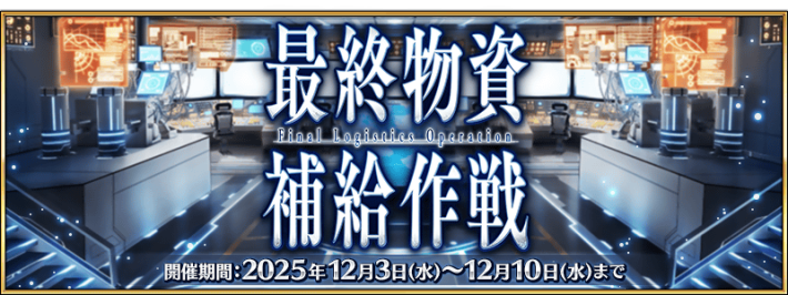 2025年12月3日(水)、FGO PROJECT(有限会社ノーツ、株式会社アニプレックス、株式会社ラセングル)が、スマートフォン向けFateRPG『Fate/Grand Order』において、恒常イベント「冠位戴冠戦:Caster」を実装した。また、同日に期間限定イベント「最終物資補給作戦」も開催された。