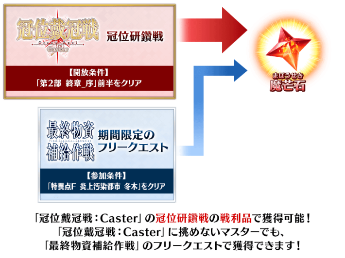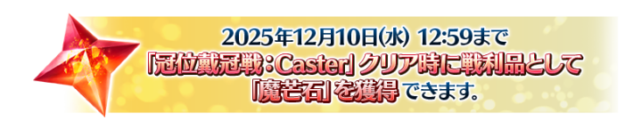 「魔芒石」は2025年12月10日(水)12:59までの間、「冠位戴冠戦:Caster」の冠位研鑽戦をクリアすることで集めることができます。