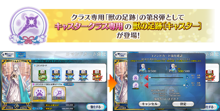 コマンドカードの強化に使用する「獣の足跡」にクラス専用のアイテムを追加いたします。 クラス専用の「獣の足跡」は対応するクラスのサーヴァントにのみ使用でき、通常の「獣の足跡」と同様の効果を得ることができます。