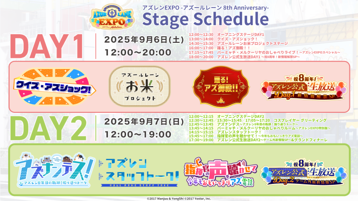 Yostarは、2025年9月6日と7日に、秋葉原で『アズレン EXPO -アズールレーン 8th Anniversary-』を開催する。ベルサール秋葉原と秋葉原UDXの2会場で行われ、特別パビリオンやステージプログラムが予定されている。