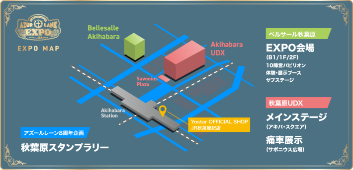 もう1つの会場となる秋葉原 UDX では、アキバ・スクエアにメインステージを設置し、「アズレン公式生放送」などの各種ステージプログラムを実施。さらにサボニウス広場では、過去のリアルイベントでも好評だった痛車展示を実施いたします。