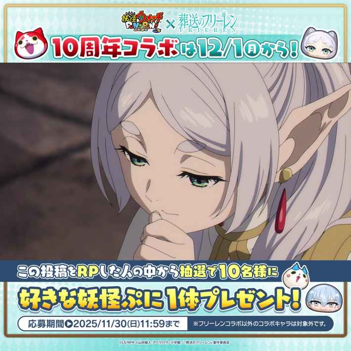 アニメ『葬送のフリーレン』コラボイベントの開催決定を記念して、『妖怪ウォッチ ぷにぷに』公式XにてコラボPVを公開 しました。さらに、公式Xをフォロー&キャンペーン投稿をリポストで、抽選で10名様に好きな妖怪ぷにをプレゼントする キャンペーンもあわせて実施しています。