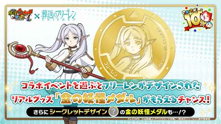 アニメ『葬送のフリーレン』コラボイベントを遊ぶと、リアルグッズ「金の妖怪メダル」を入手できるチャンスがあります。 今回のコラボイベントでは、「フリーレン」がデザインされた「金の妖怪メダル」をプレゼントします。 キャンペーンの詳細は、ゲーム内や、ぷにぷに公式Xで紹介予定です。