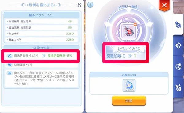 紫色品質のメモリー装備のレベル上限を開放!「突破」が可能に!