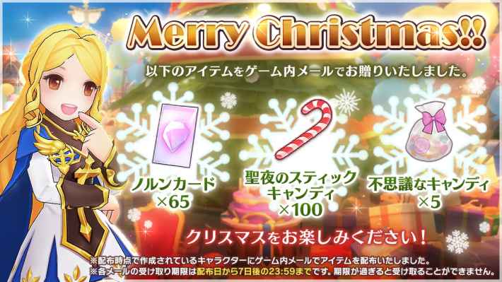 イベント「ジングルベル!クリスラグマス!!」では、12月23日(火)~12月25日(木)の間、毎日「ノルンカード」「聖夜のスティックキャンディ」「不思議なキャンディ」などの豪華アイテムを獲得できます。また、ダンジョン報酬などが期間限定でアップするなど盛りだくさんのイベントとなっています。