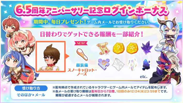 6.5周年をお祝いする「カウントダウンログインボーナス」から始まり、12月5日(金)からは「6.5周年アニバーサリー記念ログインボーナス」を実施します。新顔装備「スノーキャロット・ノーズ」などの豪華報酬を、最大20日間、毎日獲得することができます。