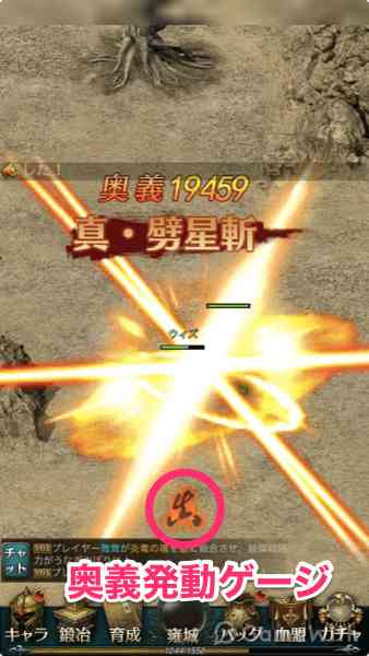 攻撃を繰り返し奥義発動ゲージが溜まったら、奥義アイコンタップで発動できる。