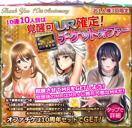 【10周年感謝!新LMRナツ/ユウキ/トウカ/キリカ含むMR全登場&確率10倍10連オファー 】