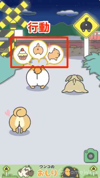 ワンコをタップすることでおしりを触るなどの行動が表示される。初めは餌をあげることしかできないので、餌をあげて好感度を上げていこう。
