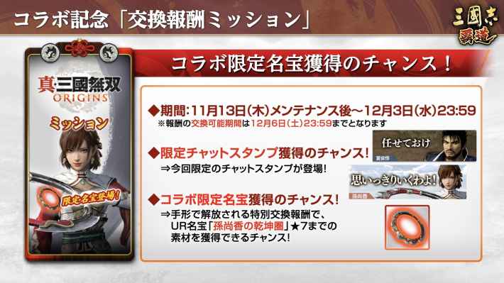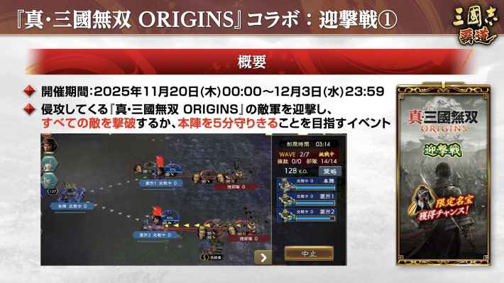 また、コラボ限定名宝「飛鳥装束」を獲得できるログインボーナスや、『真・三國無双 ORIGINS』の武将が敵として登場するイベント「迎撃戦」など、コラボにちなんだイベントやキャンペーンを開催します。