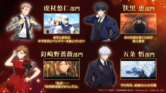 サービス開始からの2年間を振り返る企画として開催した、プレイヤーの皆様がキャラクターごとの名シーンを選ぶ投票企画「ファンパレ・オブ・ザ・イヤー」の結果を発表いたしました。数多くのストーリーイベントから、公式放送では虎杖悠仁、伏黒恵、釘崎野薔薇、五条 悟の4キャラクターのノミネートされた名シーンと大賞を発表。本企画の特設サイトでは、禪院真希、パンダ、狗巻棘、伊地知潔高の4キャラクターの結果も公開しています。