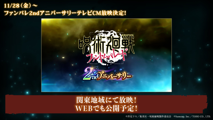 2025年11月21日(金)でゲーム配信開始から2周年を迎えることを記念して、『ファンパレ』2nd アニバーサリー公式放送を実施しました。新バージョンの虎杖悠仁と東堂 葵のイラストやゲーム内イベント、さらに2周年プロモーション展開など、2周年の2025年11月から2026年1月までのゲーム内で実施するイベントやアップデート情報をまとめて発表いたしました。
