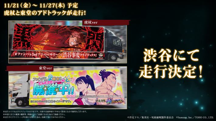 2025年11月28日(金)より、ファンパレ 2nd アニバーサリーテレビ CMの関東地域にて放映、WEBでも公開が決定したほか、11月21日(金)から11月27日(木)まで、虎杖と東堂のアドトラックが渋谷で走行することが決定。そのほか、特設サイトでミニゲームの公開や『ファンパレ』公式LINE スタンプや絵文字の販売も決定いたしました。