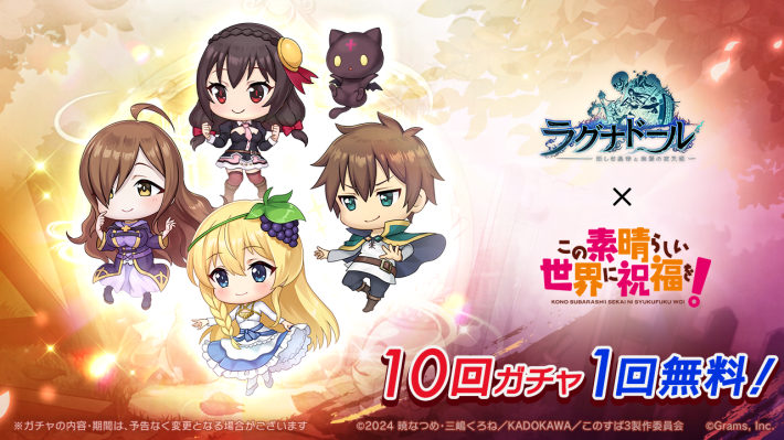 株式会社グラムス(本社:東京都新宿区、代表取締役社⻑:⾕直史)は、 iOS/Android/PC向けタイトル『ラグナドール 妖しき皇帝と終焉の夜叉姫』において、2025 年 10 ⽉ 1 ⽇(⽔) よりアニメ 『この素晴らしい世界に祝福を!』 とのコラボレーションを実施することをお知らせします。