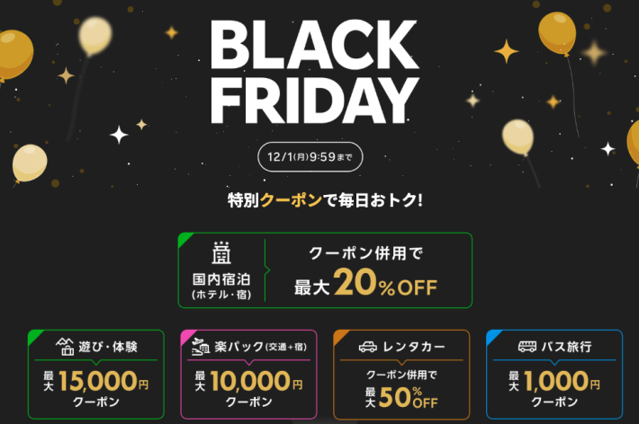 「楽天トラベル BLACK FRIDAY」は、楽天市場のセールより1日早い11月19日(水)から開催されます。