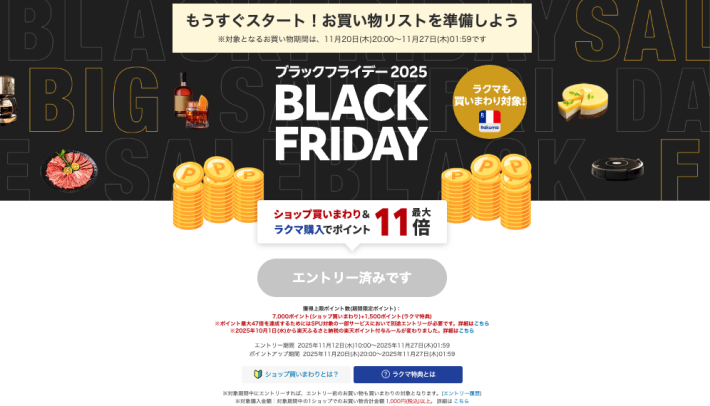 楽天ブラックフライデーの「ショップ買いまわり」によるポイントアップ(詳細は後述)の対象となるには、キャンペーンへのエントリーが必須です。