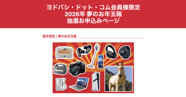 2026年の「夢のお年玉箱」に申し込むには、Webブラウザ(Safari、Google Chromeなど)から特設ページを開く必要があります。その後、「ヨドバシ・ドット・コム」に会員登録またはログインを行い、欲しい商品の抽選に申し込むことができます。