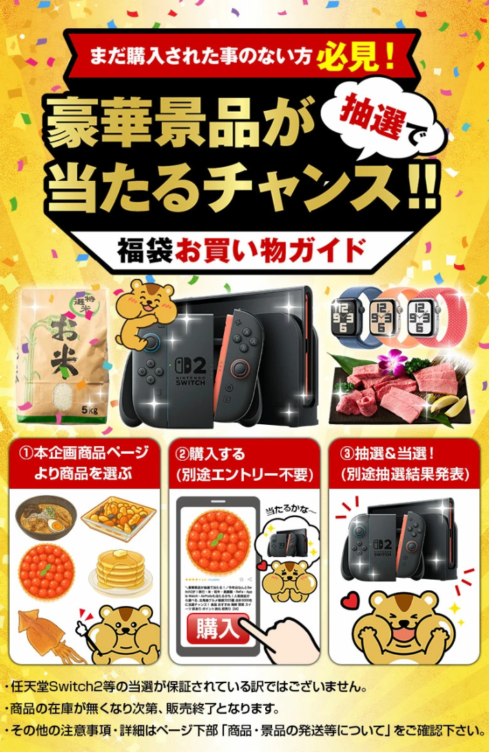 | 昨年の実績 (2025年版) | 【Web販売】12月18日頃〜順次第1弾スタート 【店頭販売】1月1日〜 【内容】PS5/Switchソフト詰め合わせ、レトロゲームセット、フィギュア福袋など |