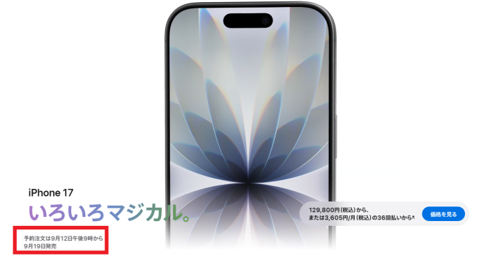 アップルイベントにて、iPhone17の発売日が9月19日(金)と発表されました。予約注文は9月12日(金)の午後9時から開始となります。値段は通常が129,800円~、Airが159,800円~、Proが179,800円~、Pro Maxが194,800円~となっています。