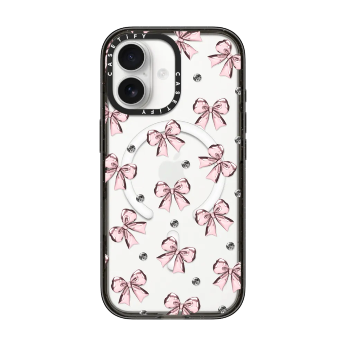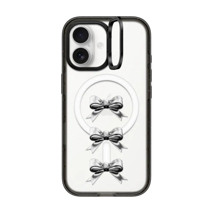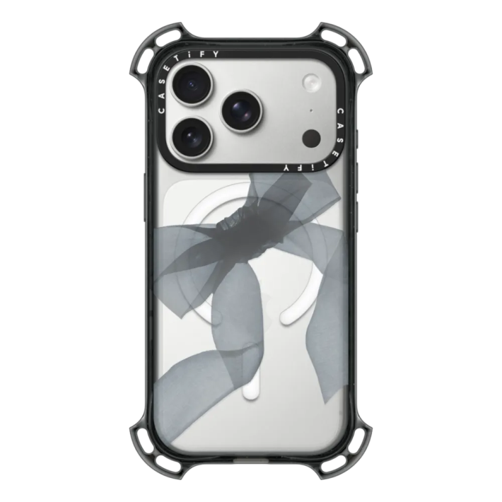 CASETiFYから発売の、大きな黒いリボンが目を引くiPhone 17 Pro用ケースです。リボンが付いていることで、シンプルながらも大人っぽく上品な雰囲気を演出してくれます。