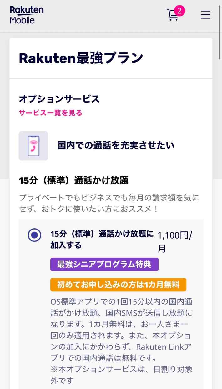 | 通話オプション | 15分以内かけ放題:1,100円 |