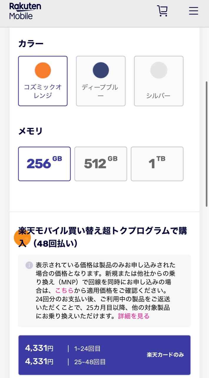 カラー、メモリ、端末の支払い方法を選択し、「カートに追加」をクリックします。