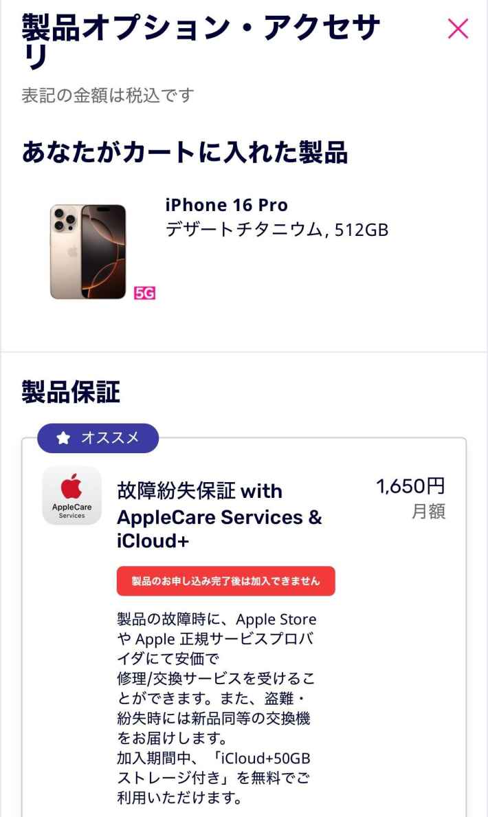 iPhoneの製品保証オプションと、ケースや充電器など一緒に購入したいアクセサリがあれば選択します。