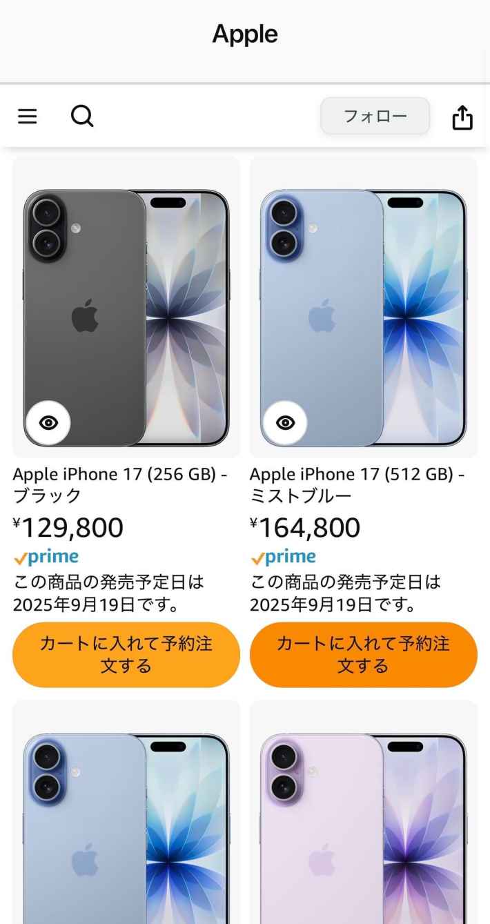 まずは「Amazon(Apple公式ページ)」へアクセスしましょう。iPhone17シリーズの予約状況が分かるため、ほしいモデルが予約受付中の場合はクリックしましょう。