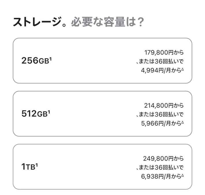 | 販売価格 | 256GB:129,800円 512GB:164,800円 | 256GB:159,800円 512GB:194,800円 1TB:229,800円 | 256GB:179,800円 512GB:214,800円 1TB:249,800円 | 256GB:194,800円 512GB:229,800円 1TB:264,800円 2TB:329,800円 |