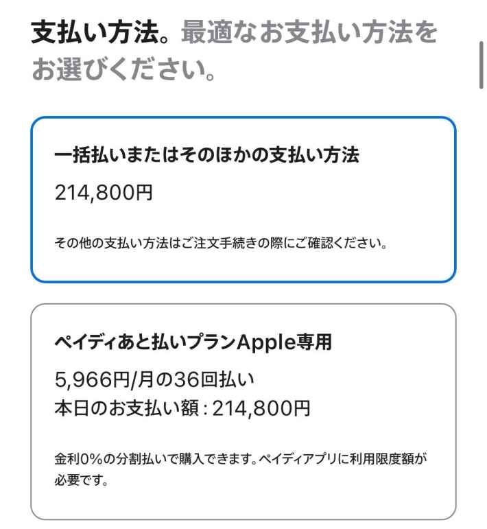 Appleでは画像の通り、大きく分けて2パターンのお支払い方法が存在します。36回払いをご利用の方は、必要に応じて「ペイディあと払いプランApple専用」をお選びください。