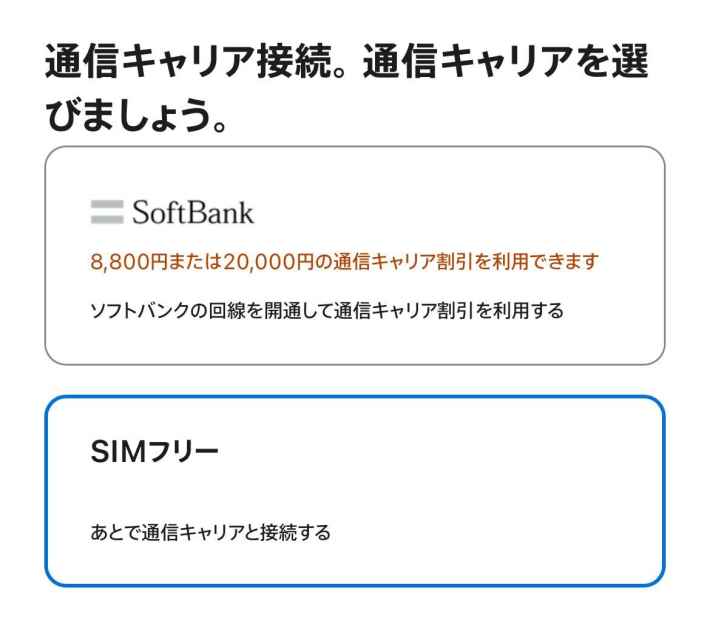色・容量が決まったら契約形態を選んでいきます。公式で購入する際は、基本SIMフリーとなりますが、SoftBankでの契約に限り同一ページから進行可能なので、必要に応じてお選びください。また、なるべく価格を抑えたい方は、以下が参考になります。