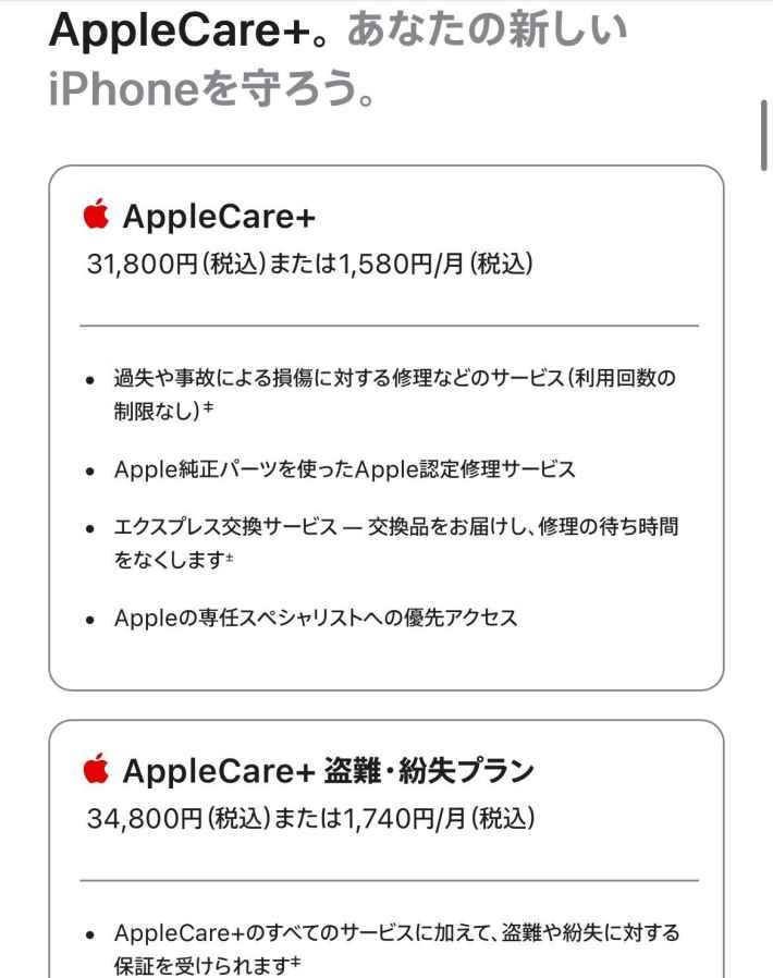 Apple公式でiPhoneを購入する際、AppleCare+や盗難・紛失プランを追加料金で選べます。こちらは完全お好みとなりますが、大切なiPhoneをしっかりと守りたい方は必要に応じてオプションを選びましょう。