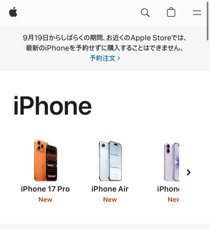 まずは「Apple公式HP」へアクセスしましょう。iPhone17シリーズ・Air専用の一覧ページがあるので、そちらへ移動できれば問題ありません。