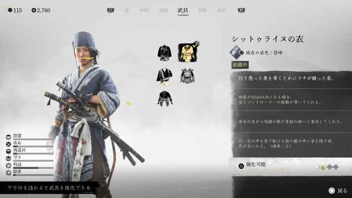 シットゥライヌの衣は探索特化の装備です。地蔵などの収集要素を見つけやすくなるので、非戦闘時は装備しておくのがおすすめです。
