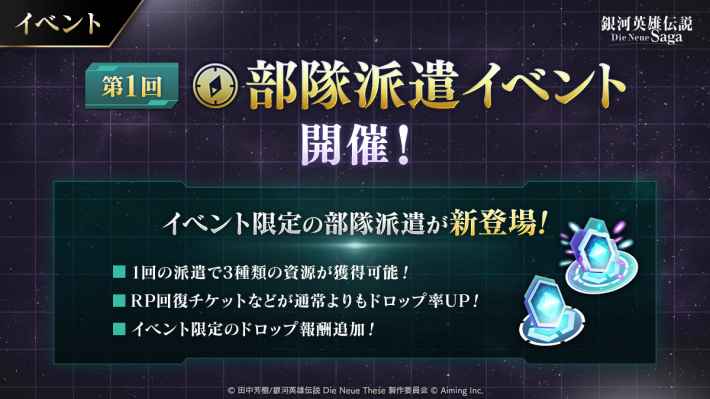 期間中部隊派遣イベントが開催中です。派遣先に「イベント」項目が追加されており、派遣することで3種類の資源を獲得できたり、追憶コアを入手できるので、期間中はイベントに派遣させておきましょう。