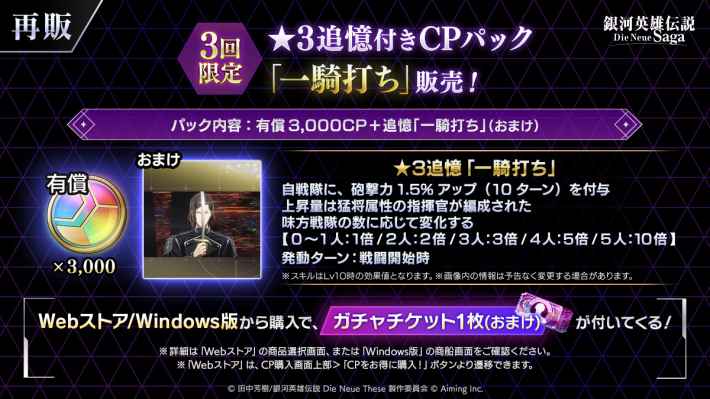 ![]() | 【おすすめ度】★★★★・ 【販売期間】12月17日(水)まで ・猛将砲撃アタッカー向けの追憶「一騎打ち」が入手可能 ・3,000有償CPも入手できる |