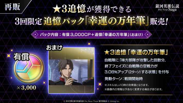 ![]() | 【おすすめ度】★★★★★ 【販売期間】12月30日(火)まで ・空戦アタッカー向けの追憶「幸運の万年筆」が入手可能 ・3,000有償CPも入手できる |