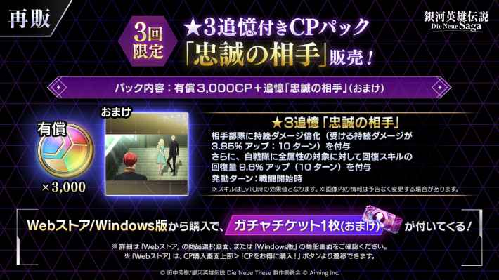 ![]() | 【おすすめ度】★★★★・ 【販売期間】12月13日(土)まで ・追憶の限界突破を行える「★3追憶増幅コア」が入手可能 ・3,000有償CPも入手できる |