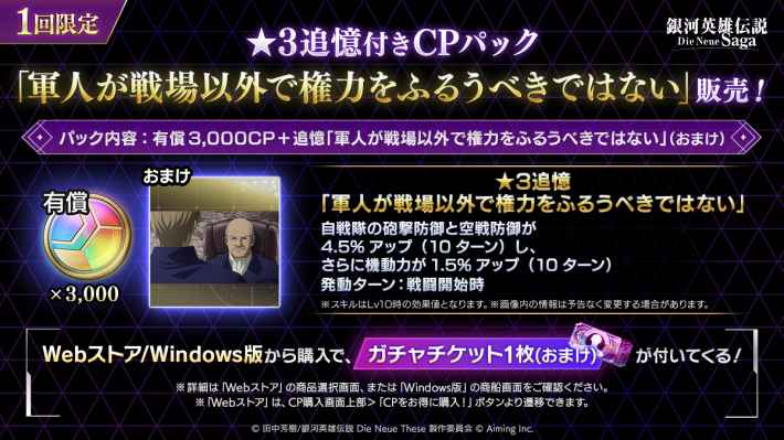 ![]() | 【おすすめ度】★★★★★ 【販売期間】12月13日(水)まで ・ディフェンダー向けの追憶「軍人が戦場以外で権力をふるうべきではない」が入手可能 ・3,000有償CPも入手できる |