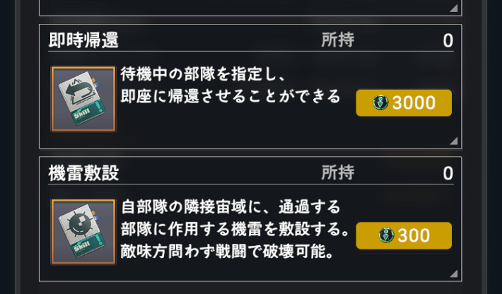 即時帰還 | 待機中の部隊を指定し、即座に帰還させることができる 1つあたり、3000個人戦術ポイント |