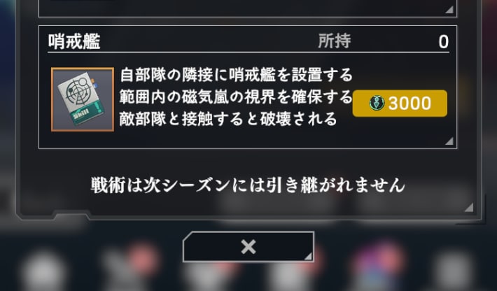 哨戒艦 | 自部隊の隣接に設置し、範囲内の磁気嵐の視界を確保できる 1つあたり、3000個人戦術ポイント |