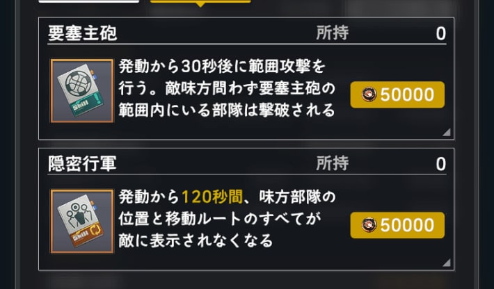 隠密行軍 | 一定時間、味方部隊の位置と移動ルートのすべてが敵に見えなくなる。 1つあたり、50000艦隊戦術ポイント |