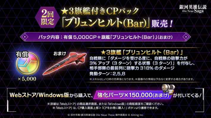 ブリュンヒルト(Bar)は2回限定で課金で入手できます。5000円で旗艦と有償5000CPを入手できるお得なパックとなっているので、砲戦メインで使用している場合は購入を検討してみましょう。
