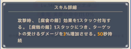 | チャージ後、現在のターゲットに大ダメージを与え、【腐蝕の鎧】効果を45スタック付与する。【腐蝕の鎧】1スタックにつき、ターゲットの受けるダメージを3%増加させる。50秒持続 |