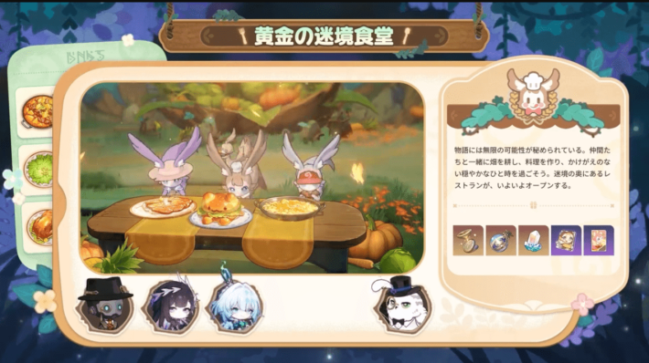 黄金裔と一緒に食堂を経営するイベントです。店長として店を切り盛りし、店の評判を上げていきます。報酬として自塑樹脂やイベント光円錐が入手できます。