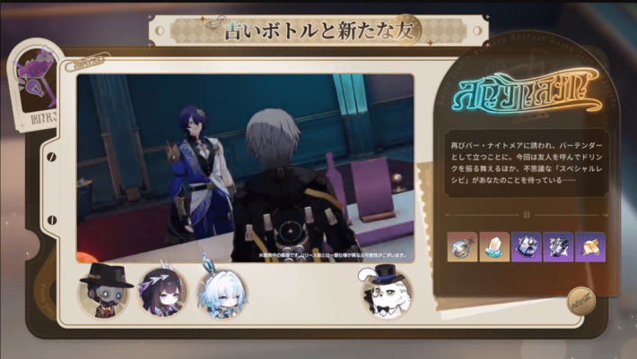 以前にもあったモクテルイベントです。今回はナイトメア劇団ではなく、キャラクターにモクテルをふるまいます。訪れたキャラクターの新たな一面が見られるかもしれません。