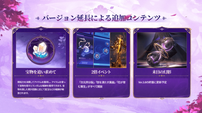 Ver.3.8は通常よりも長い8週間開催されます。それに伴い2倍イベントが3種類すべて開催されるほか「宝物を追い求めて」という開拓力を消費することでアイテムを獲得し、アイテムを使って宝物を探せるイベントが開催されます。