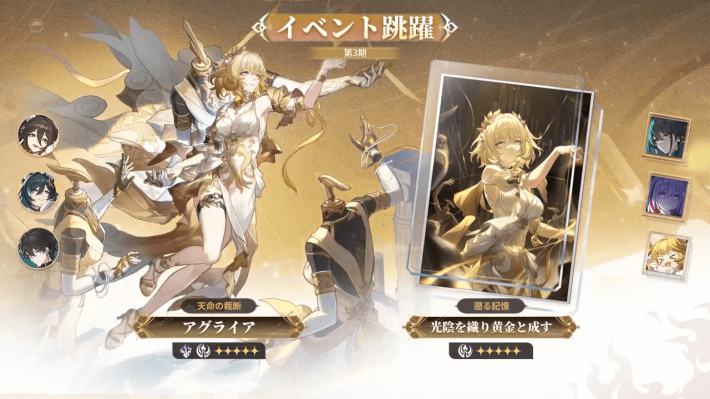 第3期ではアグライアとサンデーが復刻されます。サンデーはいまだに強力なサポーターであるほか、アグライアはマネーウォーズにおいて非常に強力なキャラです。